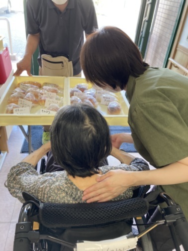 そんぽの家GH宝塚山本では、パン販売を始めました。 大阪池田市で店舗を構える「Pain de kazu」さんのパンです。 付き添うスタッフと「どれにしよう・・」「どれが良い?」などと会話も弾みます。 中には「このケースの全部頂戴!」とおっしゃられる方や、娘さまの分まで買われる方など、ご入居者さまは毎月この日を楽しみにされています。 ホームに焼き立てパンの匂いが漂い、とっても幸せな時間です。