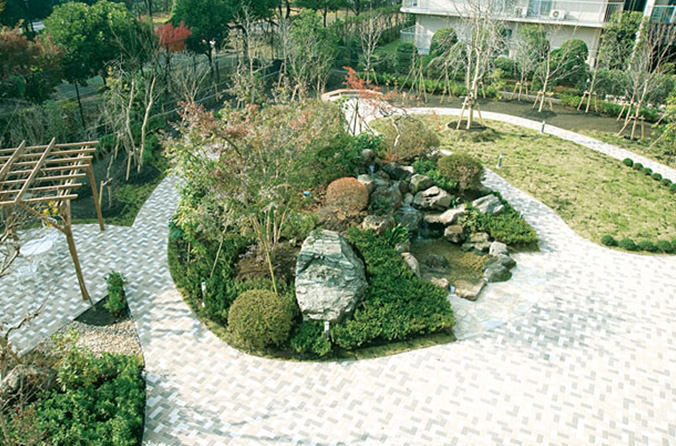 中庭の中心に滝が流れ、水の涼しげな音が心を癒してくれます。 中庭の外周は約80mで、お天気の日には外気の空気を感じながら爽快にお散歩することができます。 250坪の広い中庭をご堪能ください。