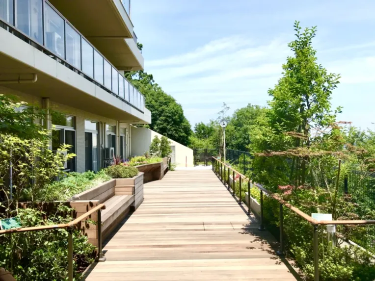 2021年4月に「認知症のある方にもやさしいデザイン」をコンセプトに新設された天然の木材を使用したウッドデッキ。 移り変わる季節の花々を楽しみながら、アクティビティや機能訓練を行います。