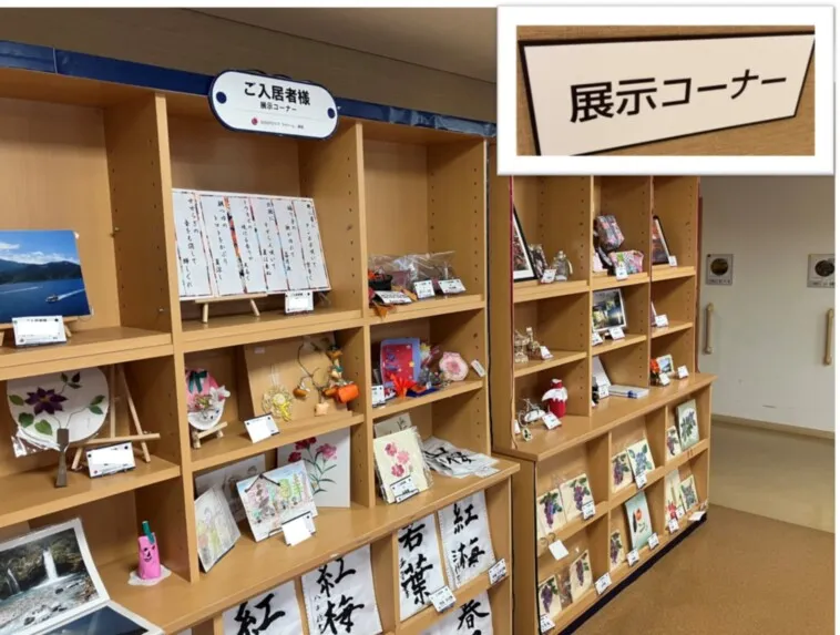 ゆっくり本を読むことができる"図書コーナー"。 懐かしの作品から最新物まで幅広く上映"映画鑑賞コーナー"。 レクレーションで作成した作品を掲示する"作品展示コーナー"。 機能訓練指導員によるリハ訓練"リハビリコーナー"と4つの共有部を自由にご利用いただく事ができます。