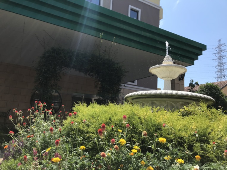 緑を感じられるエントランスです。季節ごとにお花を入れ替えており、四季折々のお花がお客様をお出迎えいたします。 ご入居者さまも散歩がてらの観賞や、日課としてお花の成長を楽しんだり、一緒にお花の手入れをされてたりしています。ご家族さまとの面会スペースに使用していただくこともあり、天気の良い日はとても気持ちが良いと評判です。