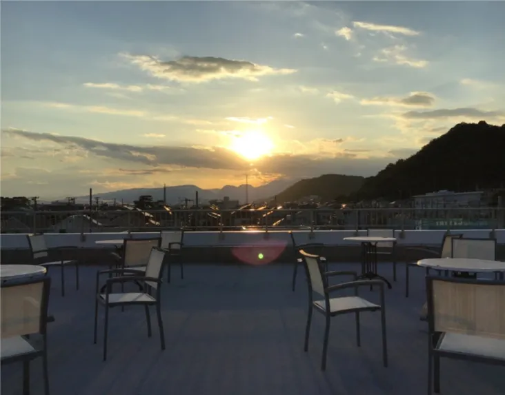 3階からテラスに出ることができ、山や海、電車などの絶景が広がっています。 ここでの深呼吸はとてもおいしく、気持ちが良い環境になっています。