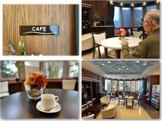 ご入居者さま・ご家族さまがゆったりくつろげるカフェスペース。 船首をイメージしたスペースで、本や新聞を読んだり飲み物を飲みながらのんびりお過ごしいただけます。