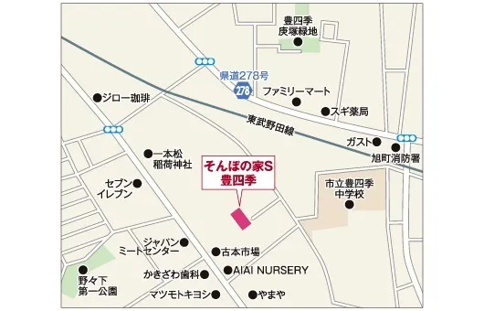 | 主な交通手段 | 【バス】 ・JR常磐線柏駅西口3番乗り場から、東武バス『免許センター』行または『流山駅東口行』(系統06)で「柏第二小学校入口」下車徒歩約7分。 「柏第二小学校入口」停留所→「稲荷神社前」交差点を右折→300m先「AIAI NURSERY(保育園)」さまを右折→200m先豊四季中学校丁字路を左折→60mを左折→70m先がホーム。 【車】 ・国道6号線「旧日光街道入り口」を曲がる→「稲荷神社前」交差点をさらに直進→300m先「AIAI NURSERY(保育園)」さまを右折→200m先豊四季中学校丁字路を左折→60mを左折→70m先がホーム。 |