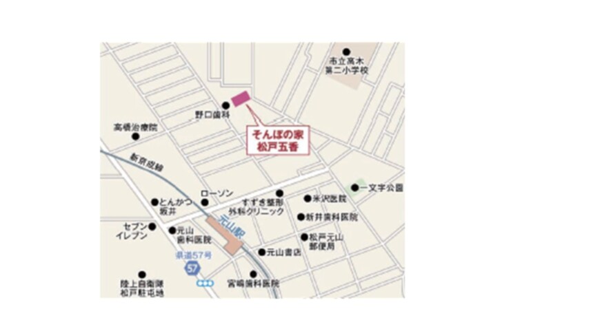 - 【電車】 ・京成電鉄松戸線「元山」駅下車、徒歩約8分。 元山駅東口」下車後左折、線路沿いにお進みください→突き当りの「ローソン」さまを右折→約200m右側の「すずき整形外科クリニック」さまを左折(そんぽの家S 五香南の横の路地を進みます)→約200m右側の「野口歯科」さま裏手が【そんぽの家 松戸五香】になります。 「野口歯科」駐車場に入っていただけますので、裏扉を抜け、施設脇より正面玄関にお回りください。 【車】 ・松戸市「五香十字路」を高柳方面へ→約1.1km先左手「バーミヤン松戸五香店」さまの前を右折→約300m先右手がホームです。