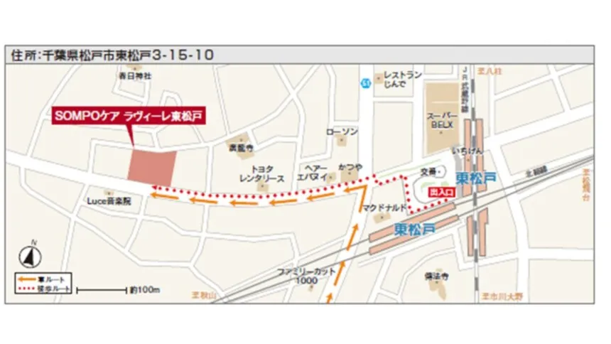 - 【電車】 ・JR武蔵野線・北総線「東松戸」駅より徒歩6分(約440m) 「東松戸」駅出入口より左方向→ロータリー正面の道路を左方向→約340m先右側がホーム 【車】 <国道6号線を「東京方面」よりお越しの場合> ・「松戸隧道」を右折→約3.9km先「高塚十字路」を左折→約860m先2つめの信号を左折→約280m先右側がホーム <国道6号線を「柏方面」よりお越しの場合> ・「岩瀬」を左折→約3.8km先右折→約280m先右側がホーム
