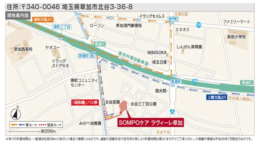 - 【公共交通機関】 <東武スカイツリーライン「獨協大学前」駅よりバスの場合> 「獨協大学前」駅西口2番乗り場より朝日バス「新田駅東口行」バス約7分 →「昭和橋」バス停下車徒歩2分(約150m) <東武スカイツリーライン「新田」駅よりバスの場合> 「新田」駅東口4番乗り場より朝日バス「獨協大学前西口行」バス約12分 →「昭和橋」バス停下車徒歩2分(約150m) 【車】 <東京外環自動車道を「浦和」方面よりお越しの場合> 「草加IC」より4分(約2km) 東京外環自動車道「草加IC」出口より国道298号線を直進 →約380m先「新善町」を左折→約310m先「清門町」を左折→約610m先3つめの信号を左折→約640m先の路地を左折→約100m先がホーム <東京外環自動車道を「三郷」方面よりお越しの場合> 「草加IC」より3分(約1.3km) 東京外環自動車道「草加IC」出口より国道298号線を直進 →約850m先「新善町(西)」を左折→約350m先の路地を左折→約100m先がホーム