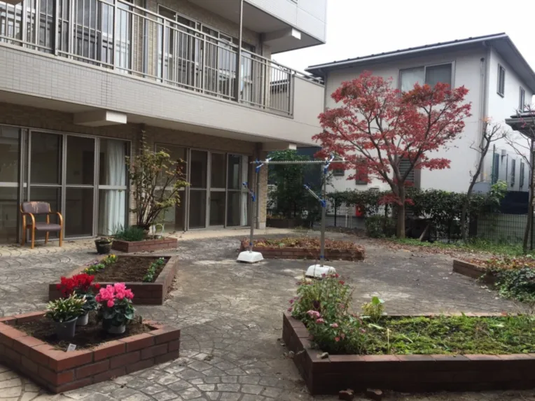 そんぽの家 大宮の中庭は四季折々のお花が咲いており、ベンチに腰掛けてのんびり過ごすことが出来ます。 ご入居者さまの中にも、中庭に出て日光浴の日課やご入居者さま同士のコミュニケーションの場にしている方もいます。 また、空いている花壇を利用してご入居者さまがガーデニングすることもできます。