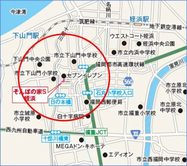 そんぽの家S姪浜の周辺には沢山の施設があります。 *買い物 スーパー、コンビニ、クリーニング店等20店近くあります。 *飲食店 ファミリーレストランや蕎麦、うどん店、パン屋等10店ほどあります。 *病院 内科・整形外科・眼科・耳鼻咽喉科・歯科医院・脳神経外科・循環器科・皮膚科等の専門のクリニック、総合病院等があります。 *その他 銀行・郵便局・美容室等があります。 また、ホームの玄関先まで来てくれる移動スーパーとくし丸やヤクルト、お弁当の訪問販売、訪問美容もございます。 ホームすぐそばにあるバス停から乗れば、バス1本で姪浜、天神方面へ向かうこともでき、アクセスの良い立地となっております。