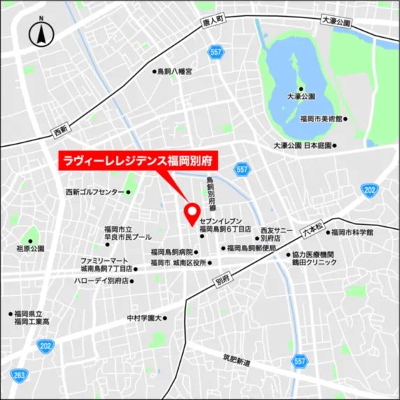 博多駅や天神へ直接アクセス可能な福岡市営地下鉄七隈線「別府駅」。周辺は多くの飲食店、公共施設で賑わっています。 【商業施設:セブンイレブン(130m)、レガネット城西店(500m)、ハローデイ別府店(550m)など】 【飲食店:寿司割烹、うどん蕎麦、うなぎ、ベーカリーなど】 【医療機関:総合病院、内科、整形外科、歯科、耳鼻科、皮膚科、整骨院など】 【公共施設:区役所、郵便局、鳥飼公民館、早良市民プールなど】 近隣には鳥飼北公園、鳥飼中央公園、鳥飼南公園、樋井川沿いの遊歩道ハミングロード、少し足を延ばせば福岡市民の憩いの場である大濠公園、日本庭園、福岡県立美術館、護国神社と豊かな環境が広がっています。