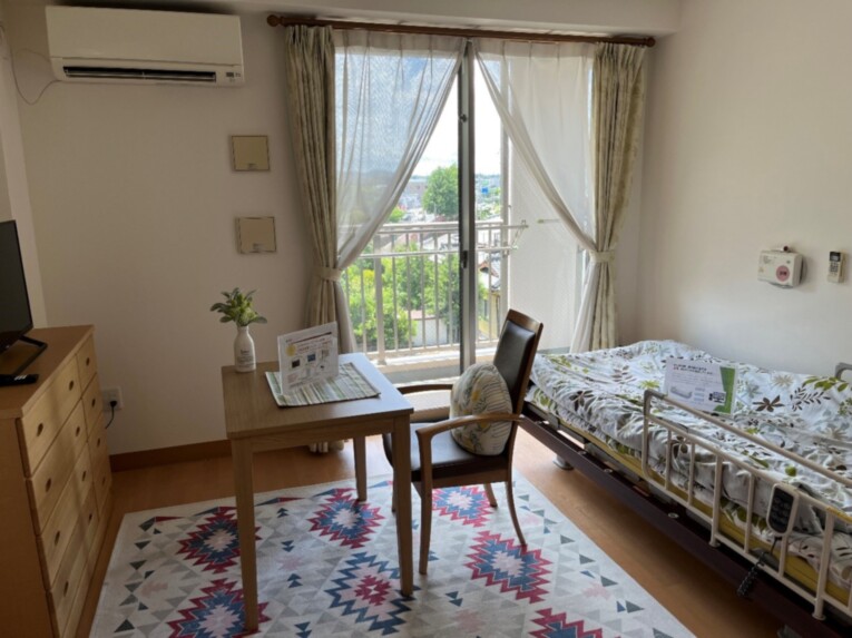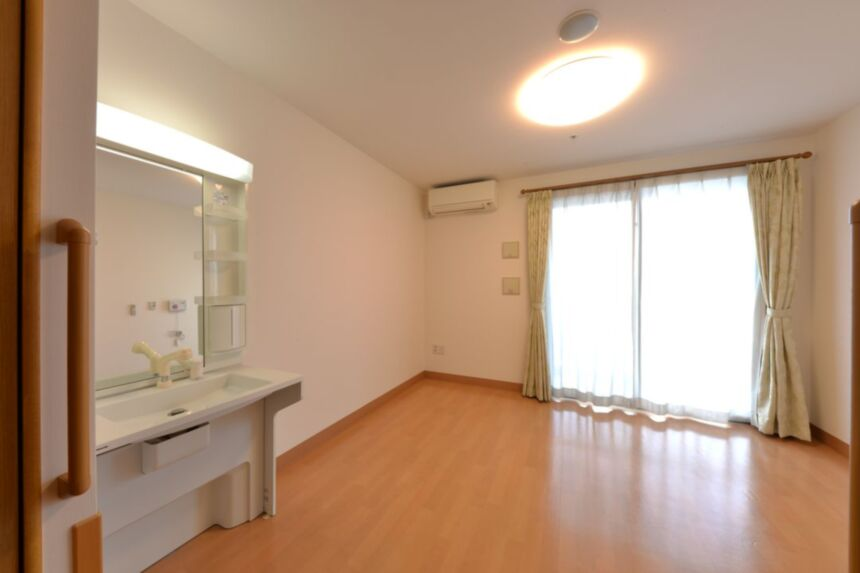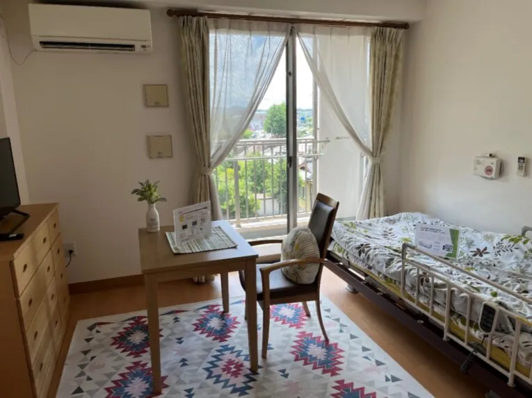 お気に入りの家具家電を持ち込んで頂いたり、ご自分らしいインテリアで楽しんでいただける広さ十分の居室です。 ミニキッチンや冷蔵庫、洗濯機を置くスペース、そしてお風呂も完備。 安心してお過ごししていただけるように、緊急コールをベッド近くとトイレ、お風呂場にも設置しています。また、車椅子での利用にも配慮されており、手すりや介護用ベッドが備え付けております。