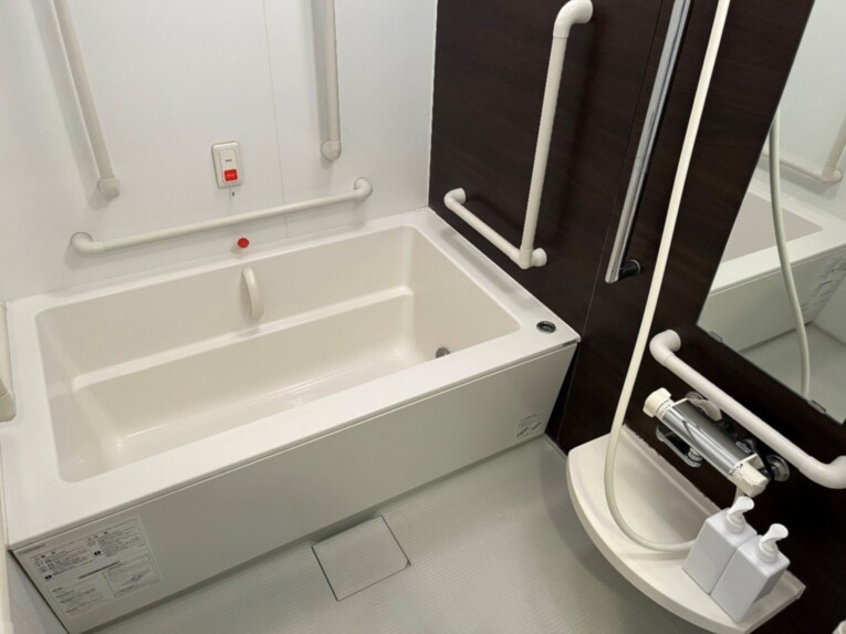 全居室にお風呂も完備されています。手すりも多いので大変入浴しやすくなっています。 また緊急コールも浴槽側とシャワー側の2ヶ所にあるので安心です。