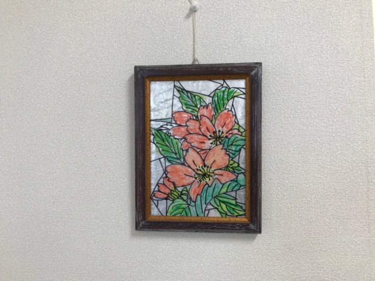 こちらは館内廊下に飾られているご入居者さまの作品です。 認知症の影響で時間や場所の認識があいまいになっても、自分の居場所がここにあるという目印の役目を果たしています。 各居室にはこういった居心地の良さを演出する取り組みがなされております。