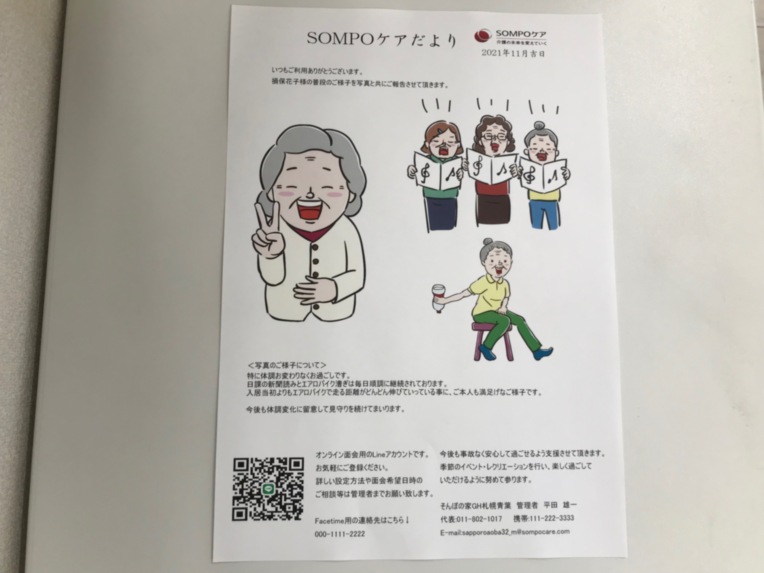 ご入居者さまそれぞれのご家族さま宛に、毎月お手紙を郵送しております。 お手紙には日常生活の何気ない瞬間を撮影したお写真とともに、最近のご様子などをお伝えしております。(※写真はイメージ)