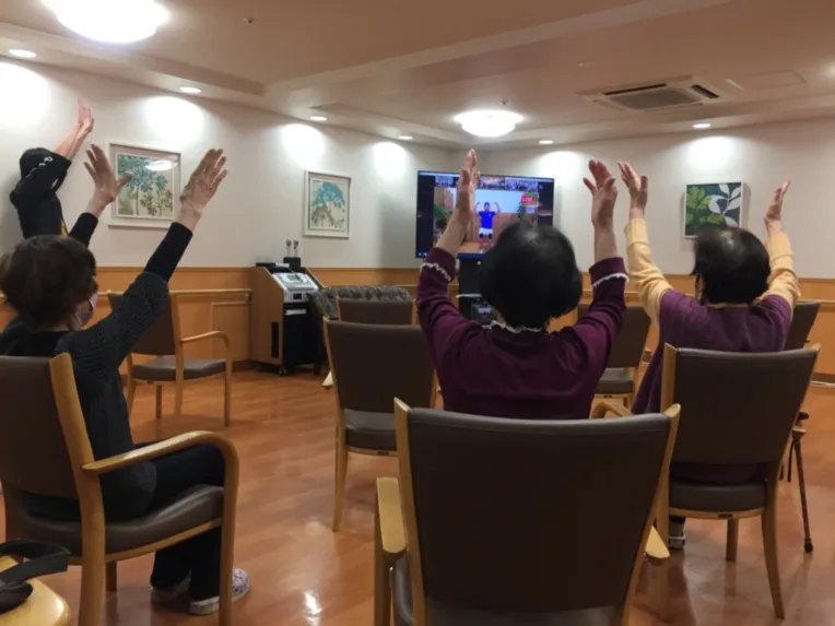 全国で展開しているスポーツクラブ ルネサンス様の体操をオンラインで実施しています。 火曜日は要介護2以下の方、金曜日は要介護3以上の方を対象として実施しています。 プロのインストラクターによる楽しく効果がわかりやすい体操はとても好評です。