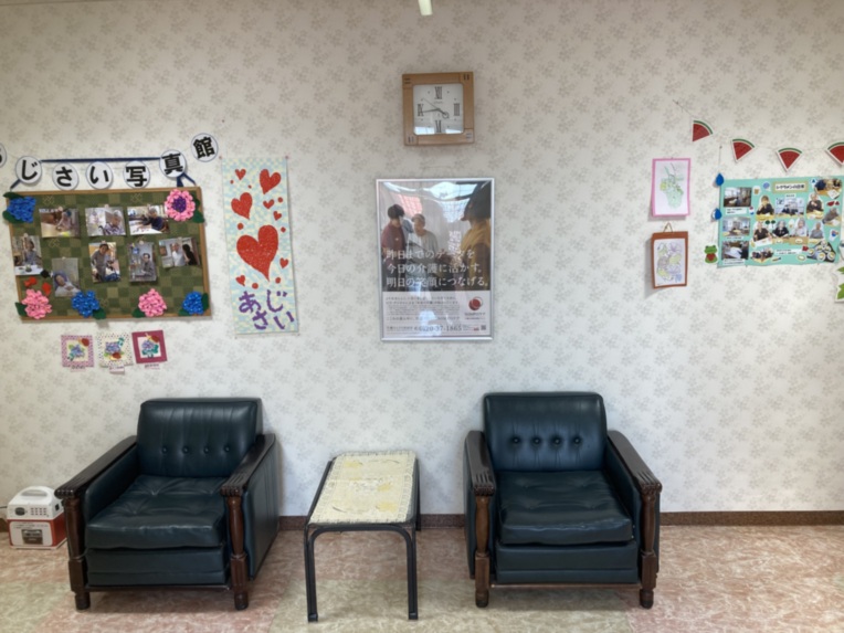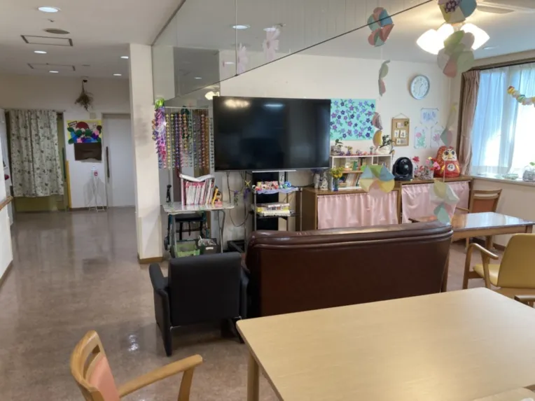 こちらはホールのテレビ前の様子です。 ソファでくつろぎながら、雑誌や本、テレビを鑑賞していただけます。 グループホームのアットホームな雰囲気が十分に感じられる空間となっています。