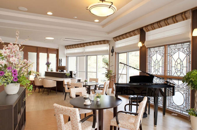 ホームエントランスにはカフェスペースを設けております。 各階で生活されているご入居者さまがお好きなお時間にお越しいただけます。新聞や雑誌を読まれたり、カフェのお飲み物を召し上がりながら、ホームから広島市内を眺望でき、優雅なひと時をお過ごしいただけます。 事務スタッフによるラテアートをご提供できることもポイントの一つです。