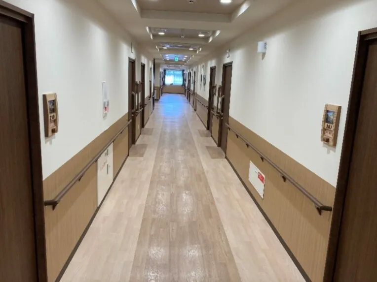 落ち着きのある色をベースにし、どちらの壁にも手すりを設置し広々とした廊下です。