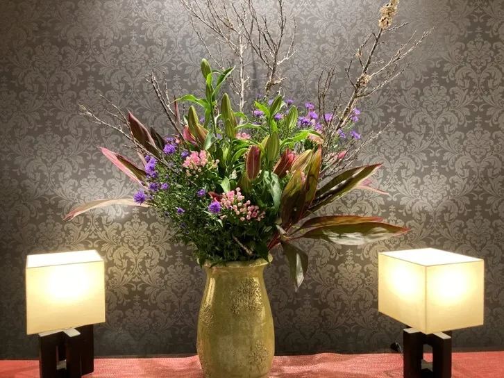 玄関・カフェ・エレベータホール、様々な場所で季節の花々がお出迎え。 「皆さまのお気持ちが華やぐように」とスタッフが心を込めて生けております。