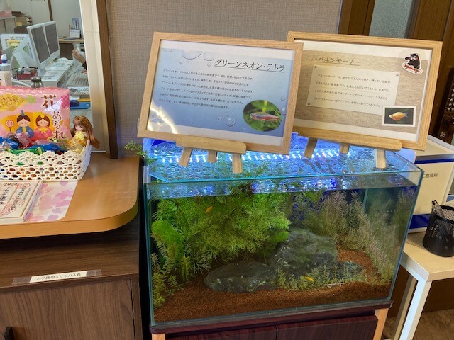 玄関ホールで熱帯魚を飼育しています。 ご入居者さま、ご家族さま、訪問診療の先生や看護師の方からも「可愛い」「癒される」と人気者です。