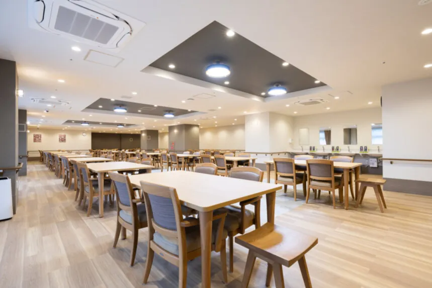 広々と開放感のある食堂では厨房スタッフがおり、温かいお食事を提供させていただいております。 食堂の隅にはソファーも置いてあり、どなたさまでもご利用いただけます。