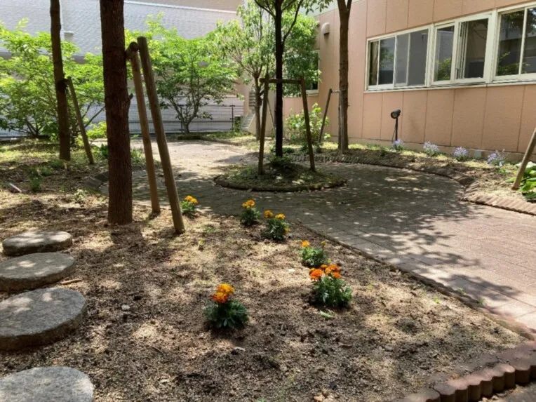ホームの中央部には、中庭がございます。 お部屋と共有部で中庭を囲むようにできているため、安全にお散歩を楽しめます。 また、どの階からでも緑や自然の風を感じていただくことができます。