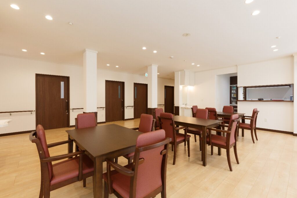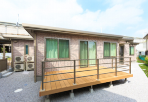 私たちは、豊かな人生を送るために、余暇活動の過ごし方も大切だと考えています。お客様の今までの生活歴に応じた趣味やイベントなどを提案し、「選んで」いただき、いろいろな体験をしていただく…人生を通しての楽しみを見つけるサポートをしていきます。 日当たりの良い明るいリビングでは、皆さんでゲームや手作り、音楽などを楽しまれています。ご自分のペースで新聞など読まれながらひと時を過されている方もいらっしゃいます。 リビングに面したテラスは、日光浴に最適、季節を感じ会話も弾みます。高速道路沿いとは思えない静かな住宅地です。