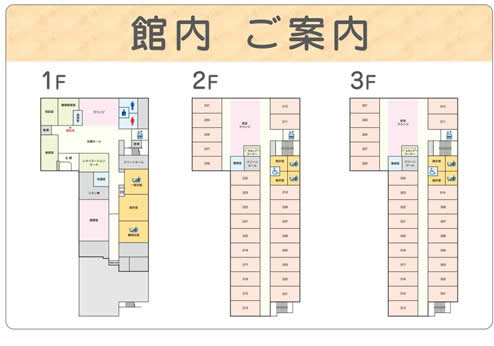 | 共用設備 | 個浴(4)、機械浴室(1)、大浴場(1)、ラウンジ、洗濯室、キッチン、相談室、トイレ、駐車場 |