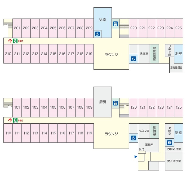 | 共用設備 | ダイニングコーナー、機能回復訓練コーナー、一般浴室、個浴室、機械浴室、脱衣室、洗濯室、 健康管理室、相談室、エレベーター、車椅子対応トイレ(オストメイト一部対応あり)、スプリンクラー |