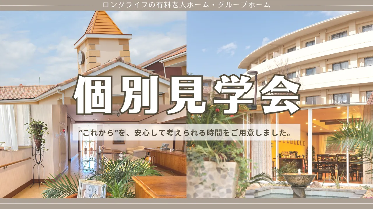 “これから”を、安心して考えられる時間をご用意しました。 ★★★見学会とは?★★★ 館内の雰囲気や実際の生活の様子、設備、提供サービスなどをスタッフが丁寧にご案内いたします。 また、入居に関するご相談につきましても個別に承りますので、ご希望や細やかな条件等もお聞かせください。 ★★★こんな方におすすめ!★★★ ① できるだけ早く入居を検討したい方 サービス内容・館内環境・料金などを具体的に確認できます。 ② 将来に備え、情報収集を進めておきたい方 早めの見学で、将来の選択肢をより安心して考えられます。 ③ ご家族や大切な方のために検討されている方 「ここなら安心できるか」を実際に見て確かめていただけます。 ★★★見学会の概要★★★ ・参加費:無料 ・定員:各日2組限定 ・開催日:毎週金・土曜日 ・時間:第一部10:00~/第二部14:00~ ・見学時間:1~2時間程度(ご希望承ります) ・当日の流れ:ご説明~館内ご見学~ご質問・ご相談 ※上記日にち・時間以外でも対応可能です。お気軽にお問い合わせください。