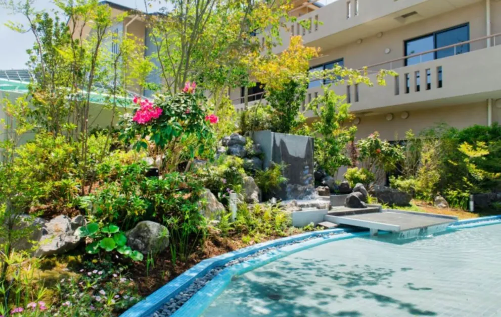 敷地内は花や緑で彩られ、水が流れ、風や光といった、自然の恵みを感じられるように設計されています。庭を散歩するとき、ロビーやレストランにいるとき、居室でくつろいでいるとき、いつも“五感に心地よさ”を感じられます。 居室はすべて個室でプライバシーを尊重し、ご自身の好きなものに囲まれて、快適に日々を過ごすことができます。