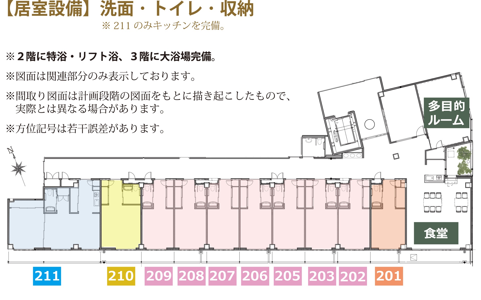 | 居室設備 | 2階居室:洗面・トイレ・収納・エアコン 3~5階居室:キッチン・浴室・洗面・トイレ・収納・エアコン |