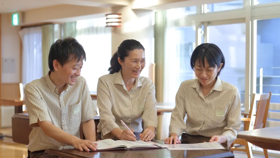 職種や担当するフロアに関係なく情報共有を密に行うことで、スタッフ全員がお客様お一人おひとりの状態を把握しています。また、人員配置は1.5:1。24時間の介護・看護体制に加え、外部の医療機関と連携することで緊急時も迅速な対応が可能です。内外の専門スタッフと連携し、安心・安全な生活をお届けします。※職員配置体制は満床時の常勤換算(週40時間)で計算しております。
