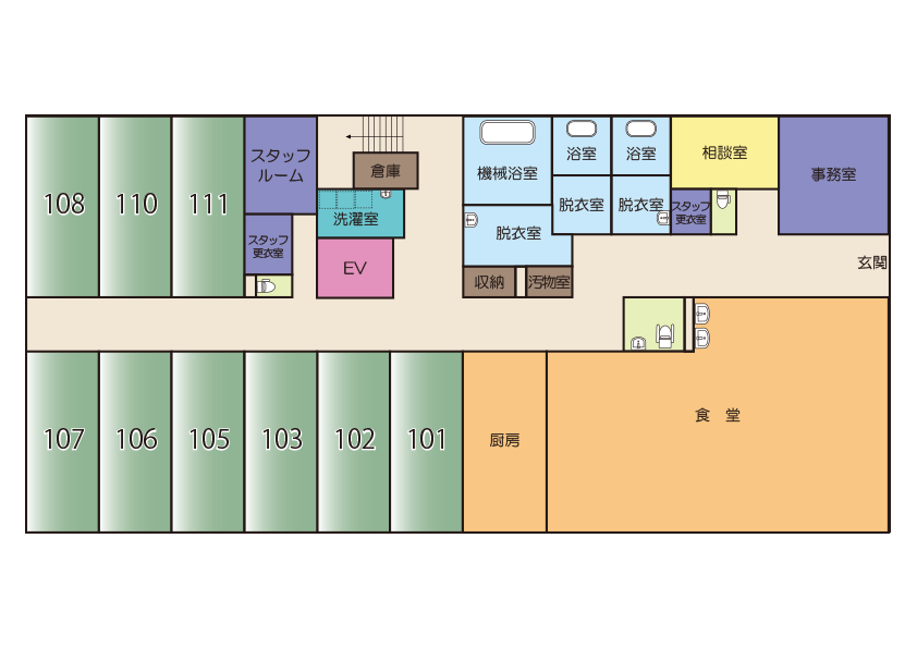 | 共用設備 | 食堂・浴室(個室浴室・機械浴室)・洗濯室・エレベーター・トイレ・相談室 |