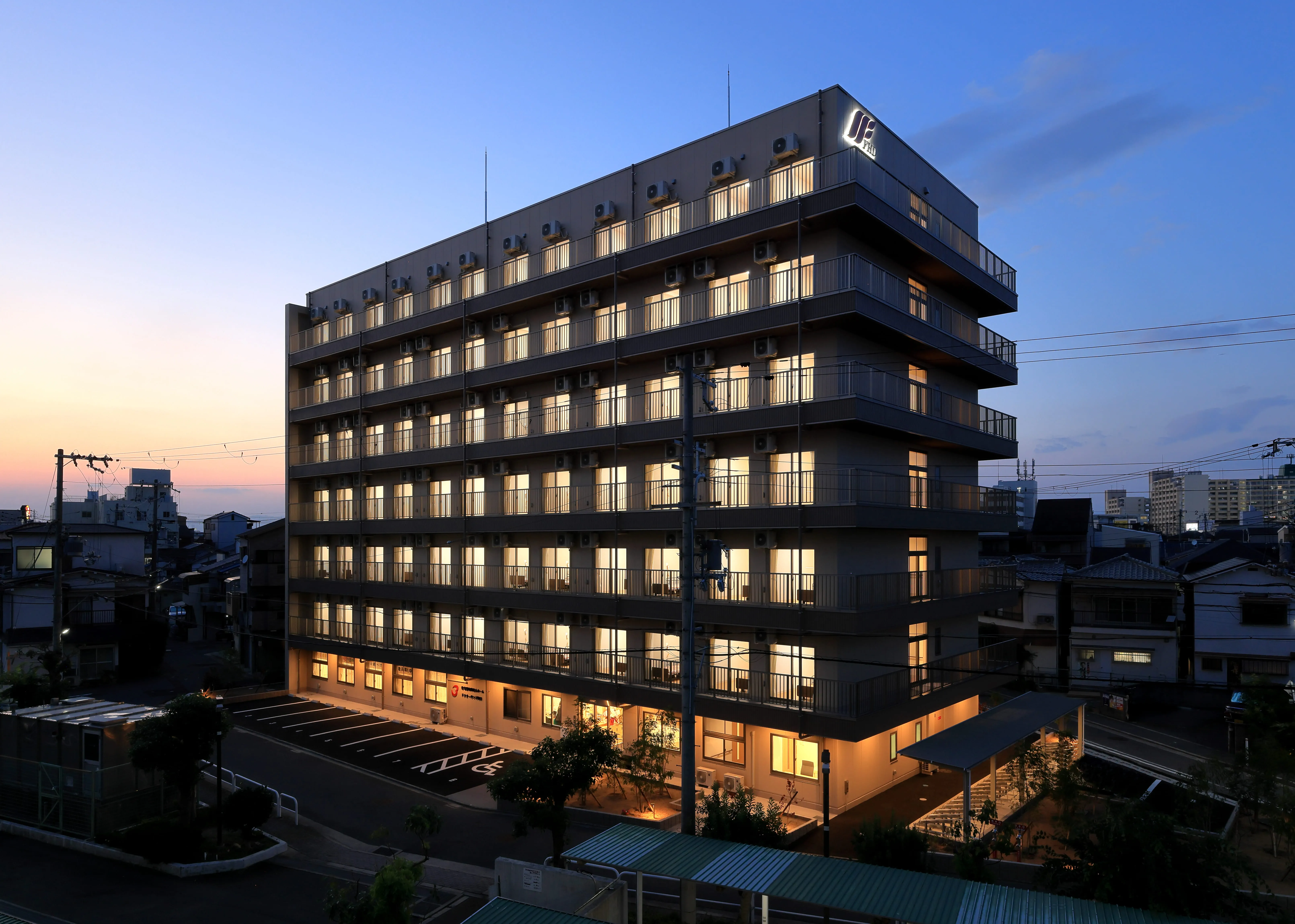 | 共用設備 | 食堂、健康相談室、一般浴室(12室)、機械浴室(2室) 車椅子用トイレ(2室)、洗濯機15台(乾燥機つき) |