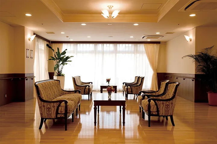 | 居室設備 | ●オゾン消臭装置 ●収納家具 ●冷暖房 ●天井照明 ●電動リクライニング式ベッド ●温水洗浄便座付トイレ ●洗面台 ●応接セット ●木製キャビネット ●カーテン ●フットライト ●コールボタン ●スプリンクラー |