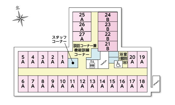 | 共用設備 | ●オゾン消臭装置 ●浴室(一般浴槽・特殊浴槽・個別浴槽) ●冷暖房 ●健康管理室 ●相談室 ●温水洗浄便座付トイレ ●洗濯乾燥機 ●談話コーナー兼機能訓練コーナー ●食堂 ●エントランス ●ストレッチャー対応EV ●スプリンクラー |