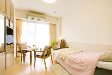 | 居室設備 | ●オゾン消臭装置 ●収納家具 ●冷暖房 ●天井照明 ●電動リクライニング式ベッド ●温水洗浄便座付トイレ ●洗面台 ●応接セット ●木製キャビネット ●カーテン ●フットライト ●コールボタン ●スプリンクラー |