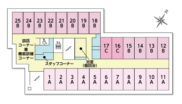 | 共用設備 | ●オゾン消臭装置 ●浴室(一般浴槽・特殊浴槽・個別浴槽) ●冷暖房 ●健康管理室 ●相談室 ●温水洗浄便座付トイレ ●洗濯乾燥機 ●談話コーナー兼機能訓練コーナー ●食堂 ●エントランス ●ストレッチャー対応EV ●スプリンクラー |