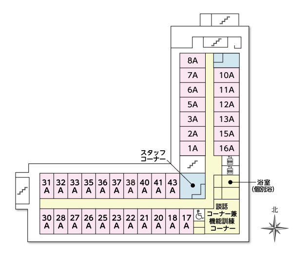 | 共用設備 | ●オゾン消臭装置 ●浴室(一般浴槽・特殊浴槽・個別浴槽) ●冷暖房 ●健康管理室 ●相談室 ●温水洗浄便座付トイレ ●洗濯乾燥機 ●談話コーナー兼機能訓練コーナー ●食堂 ●エントランス ●ストレッチャー対応EV ●スプリンクラー |