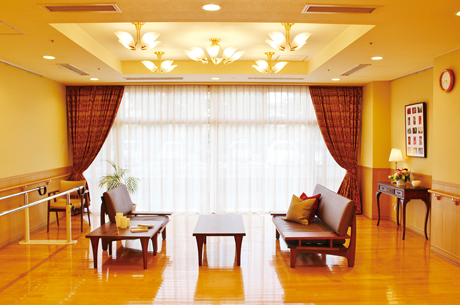 | 居室設備 | ●オゾン消臭装置 ●収納家具 ●冷暖房 ●天井照明 ●電動リクライニング式ベッド ●温水洗浄便座付トイレ ●洗面台 ●応接セット ●木製キャビネット ●カーテン ●フットライト ●コールボタン ●スプリンクラー |
