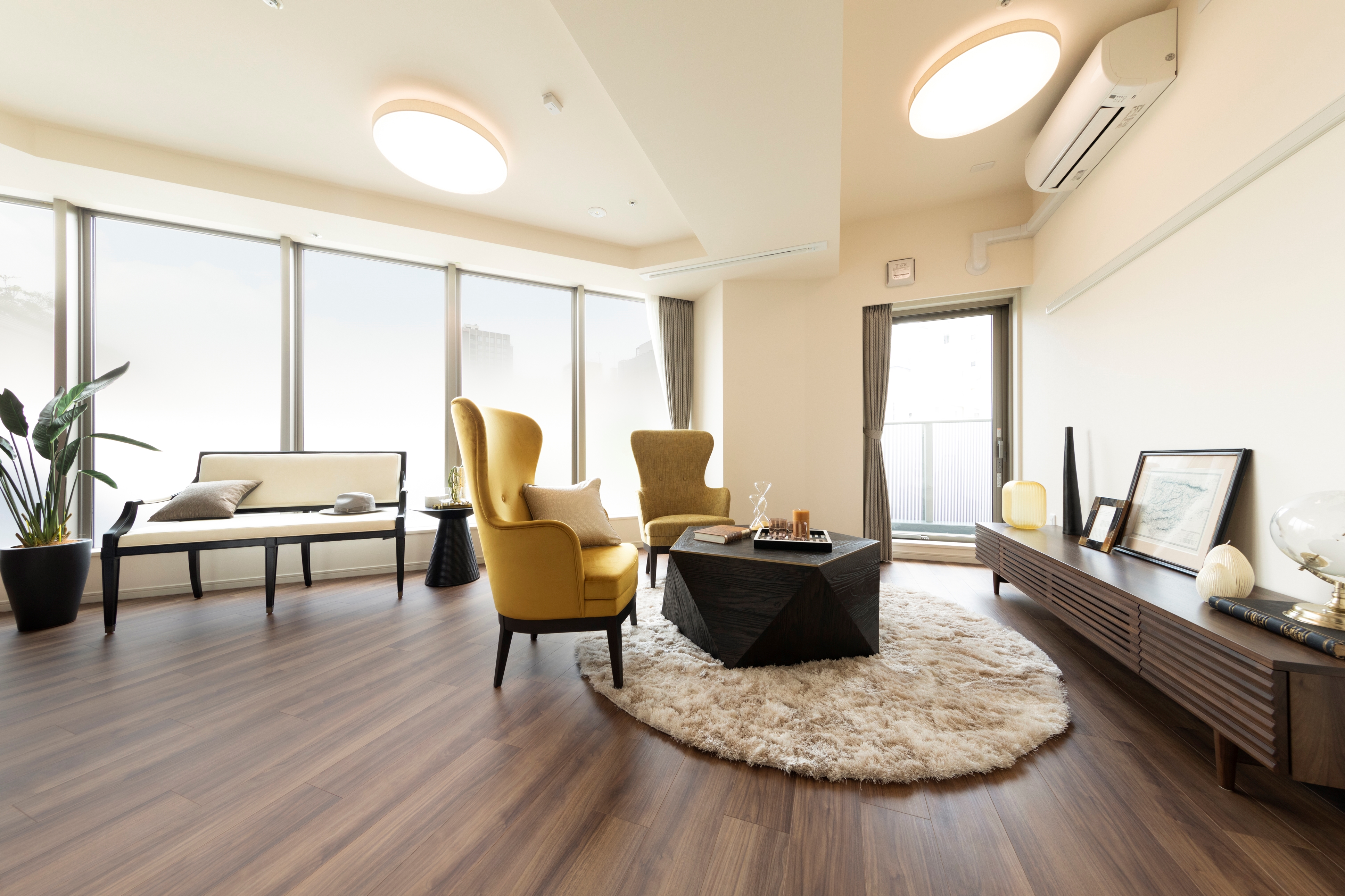 | 居室設備 | ●収納家具 ●冷暖房 ●床暖房 ●天井照明器具 ●電動リクライニング式ベッド ●洗面台 ●温水洗浄便座付トイレ ●カーテン ●フットライト ●コールボタン ●スプリンクラー <Aタイプ> ●ミニキッチン ●チェスト ●ソファ ●サイドテーブル <Bタイプ> ●ミニキッチン ●デスクキャビネット ●チェア <C・Dタイプ> ●ミニキッチン ●デスクキャビネット ●チェア ●ソファ ●サイドテーブル <Eタイプ> ●キッチン ●ダイニングテーブルセット ●洗濯機パン ●AVキャビネット ●チェスト <F・Gタイプ> ●キッチン ●ダイニングテーブルセット ●洗濯機パン ●浴室 ●AVキャビネット ●チェスト |