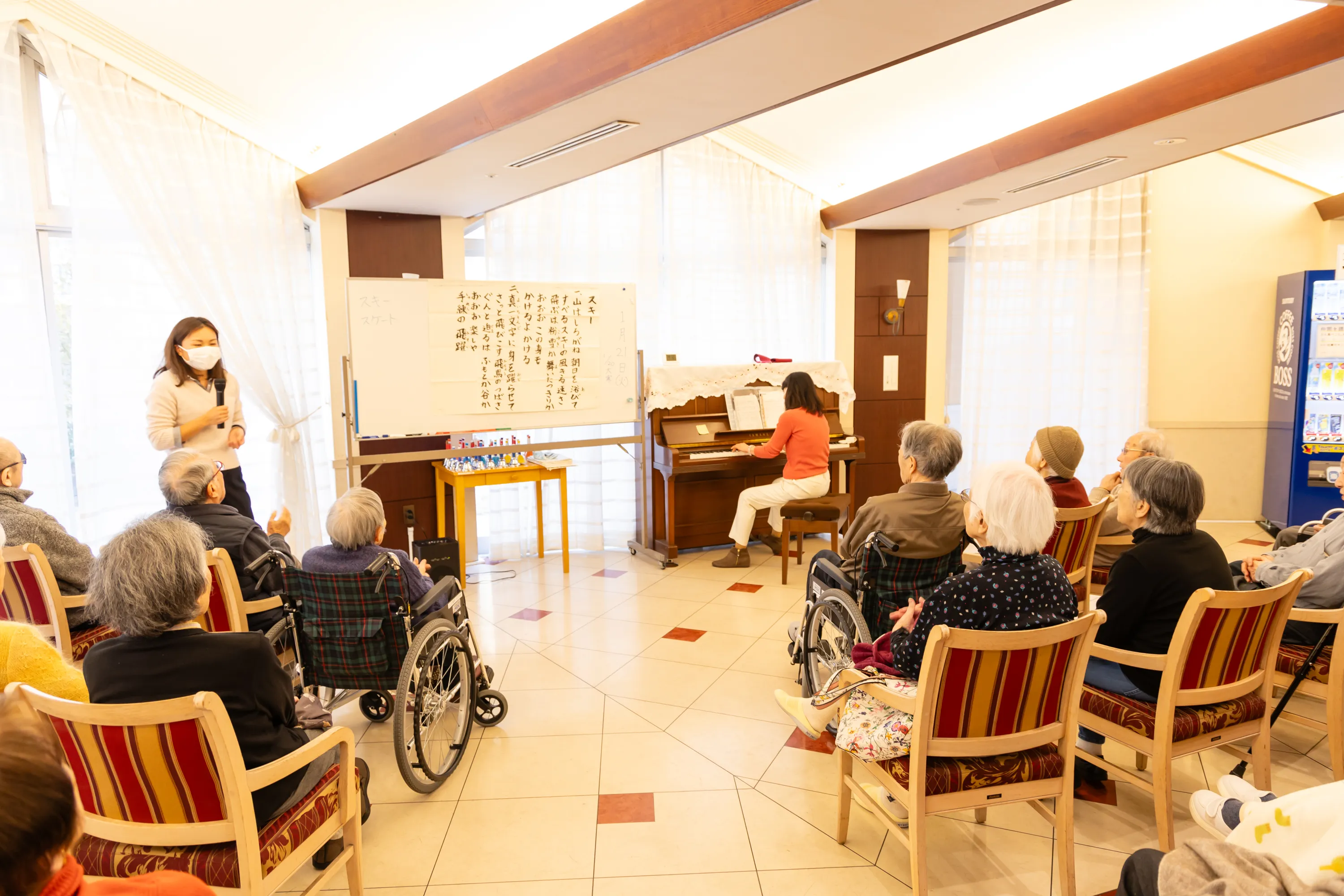 毎週1回、音楽療法士を招いて行われるプログラムです。(有料)音楽の特性を活かし、健康維持や心身の機能維持・改善を目的としています。