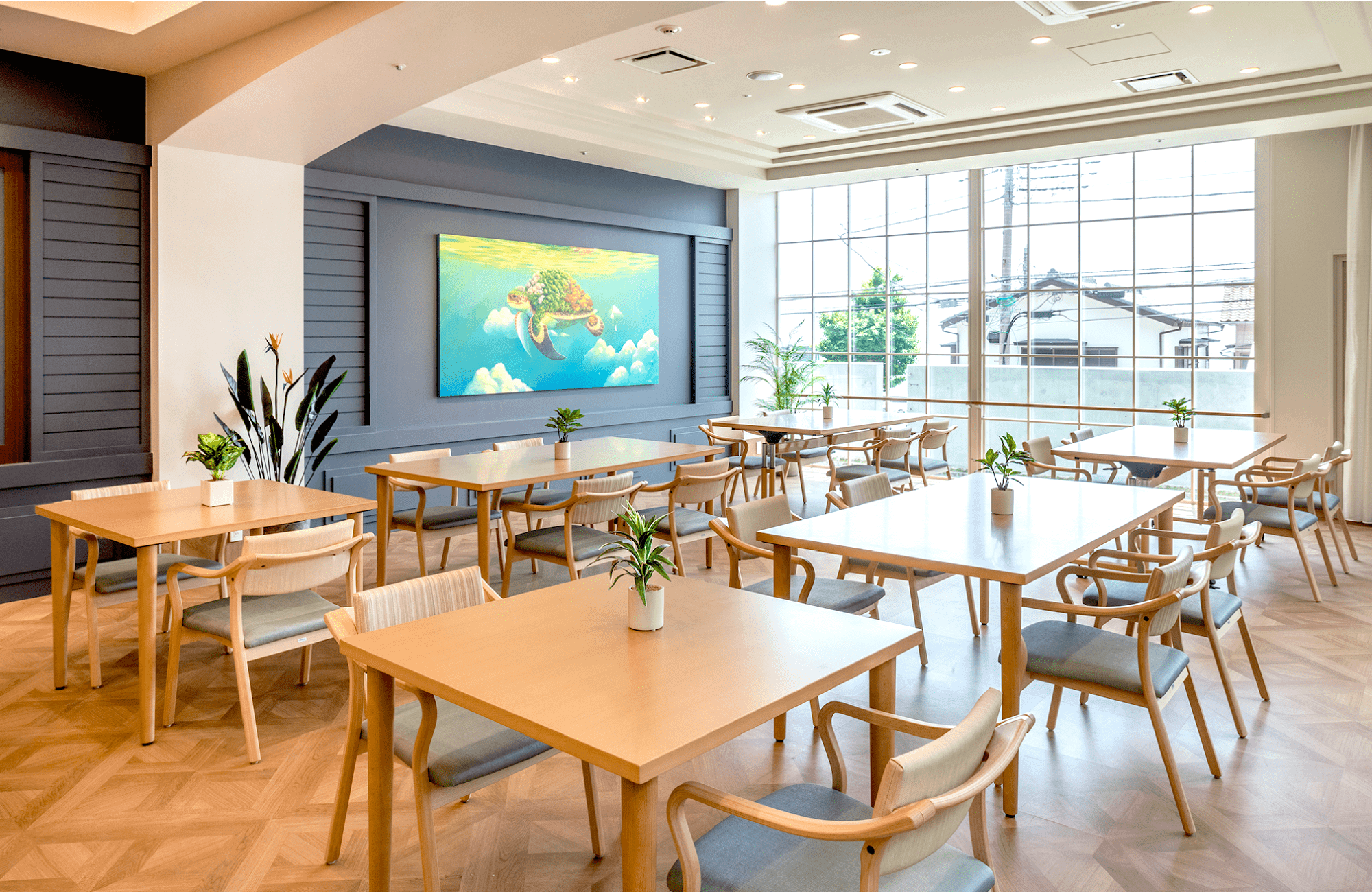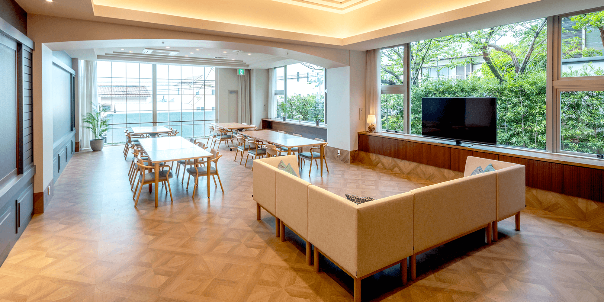 光が燦燦と差し込む大きな窓、全面に臨む水平線と夕陽。葉山の移りゆく景色に心を癒される開放的な空間です。当施設は「葉山うみのホテル」に併設され、ホテル内のラウンジや温泉などの共用施設がご利用いただけます。面会時にはホテルにご宿泊も可能です。ご自宅で過ごす時のように、ご家族の皆さまにもお寛ぎいただきたく思っています。