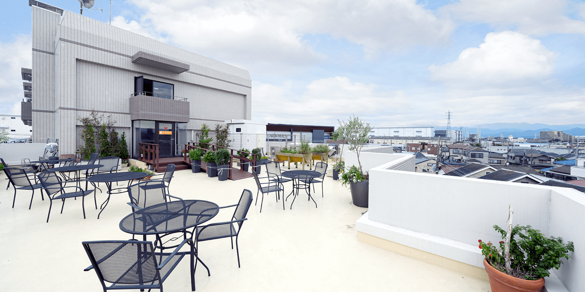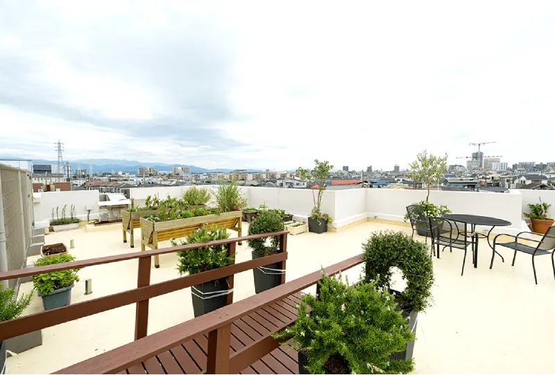 ガーデンテラスの中で最も広い、200平米を越えるスカイガーデンがとりわけ人気。木製のブリッジが庭園入口から奥へといざない、四季折々の植物と素晴らしい眺望が楽しめます。 ブリッジの先にはシンボルツリーのオリーブが元気に育ち生命力を感じさせてくれます。大小さまざまなプランターに月桂樹やアカシア、オリーブやローズマリーなど果樹園をイメージさせる植物が植わっており、一年を通して花が咲き誇ります。 施設の南側の花壇には、数種類のゆずの木を中心に一年を通して緑と花が楽しめるように植栽しています。