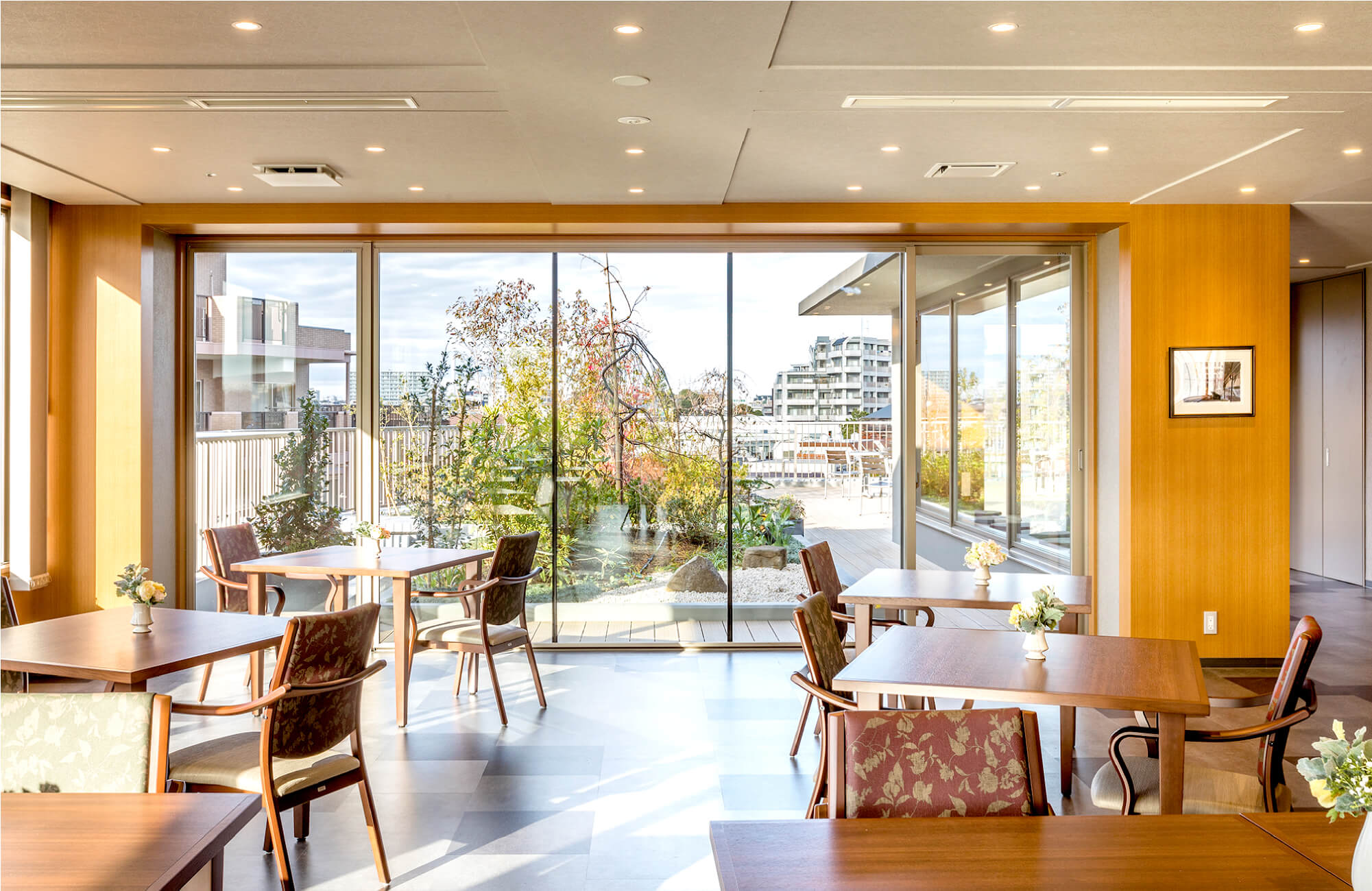 窓に広がる砧公園を一望できる、最上階のダイニング。ご入居者さま同士で交流を楽しむ、お庭のある優雅なラウンジや談話コーナー。テラスデッキのある明るいデイサービス。屋上からは、晴れた日には富士山が見えるパノラマガーデンがあり、自然に囲まれた豊かな日々をこの邸宅でお過ごしください。