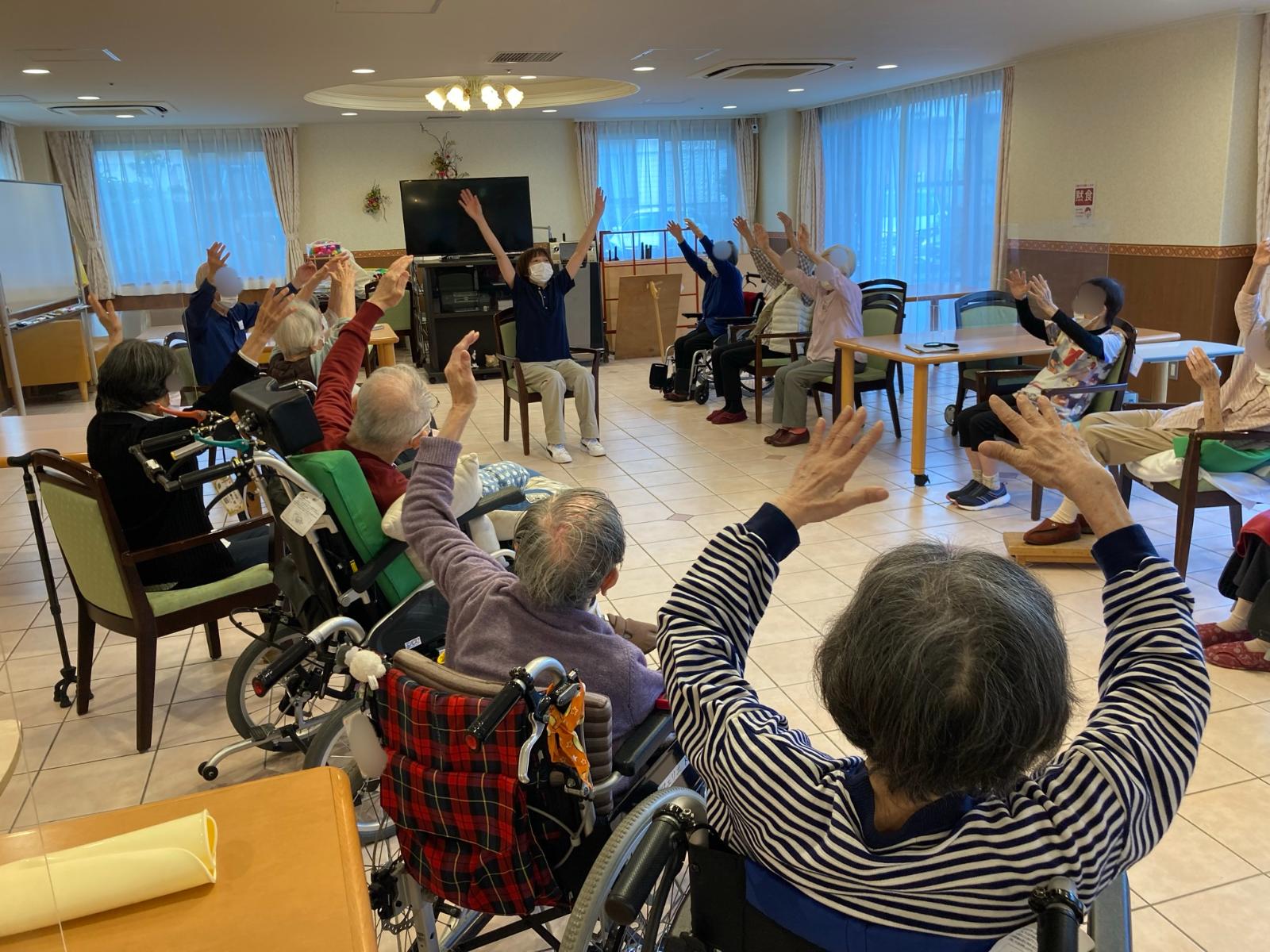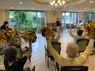 外部講師によるフレッシュ体操を行います。音楽にのせて、しっかり運動、良い生活リハビリになります。外部の講師は元鴨居のスタッフなんですよ!土日は外部の方を招いたりして、イベントを開催しています。