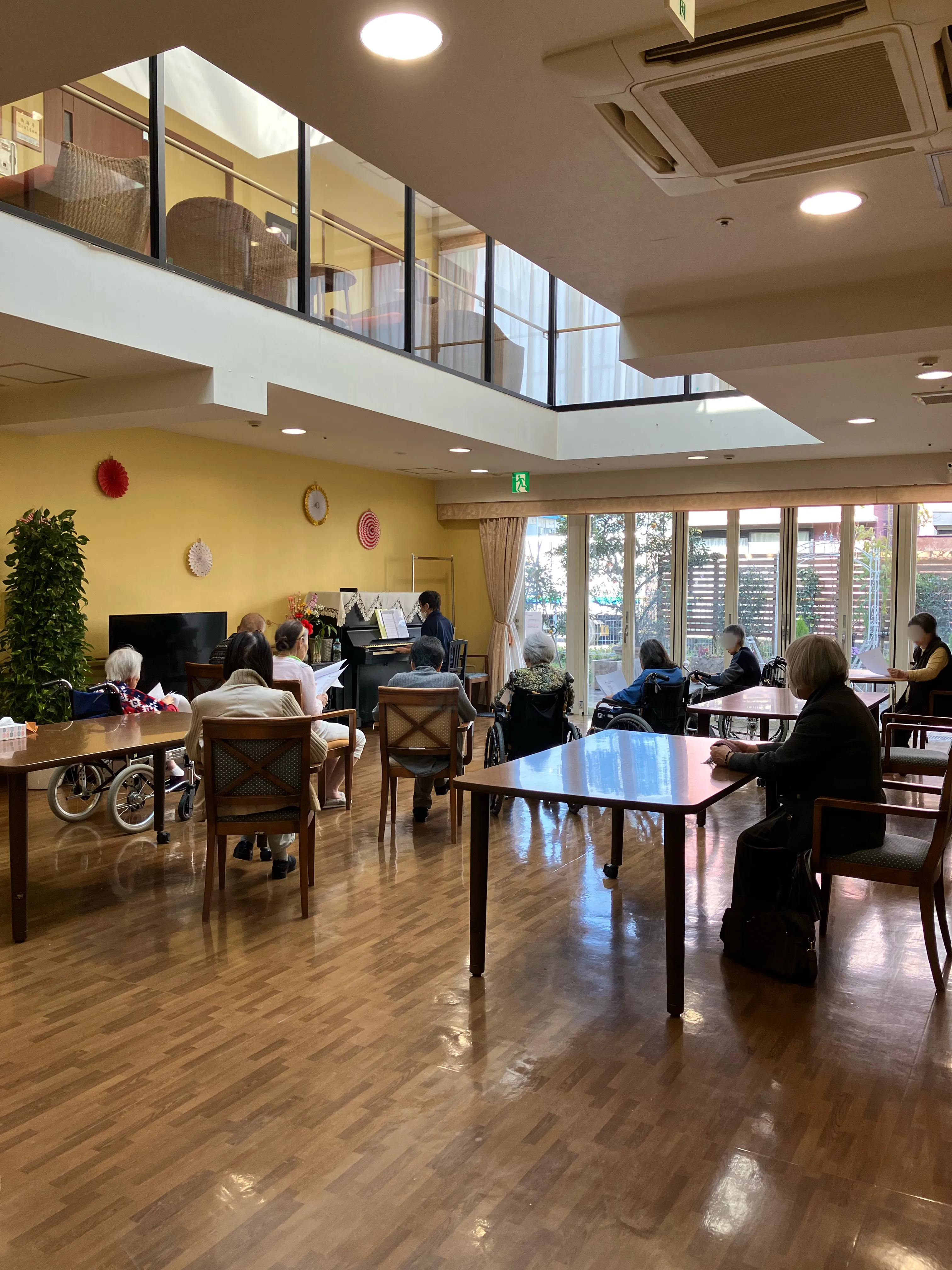 職員がピアノを生演奏!発声から始まり、たくさんの歌を歌い、リズムに合わせて体操を行います♪
